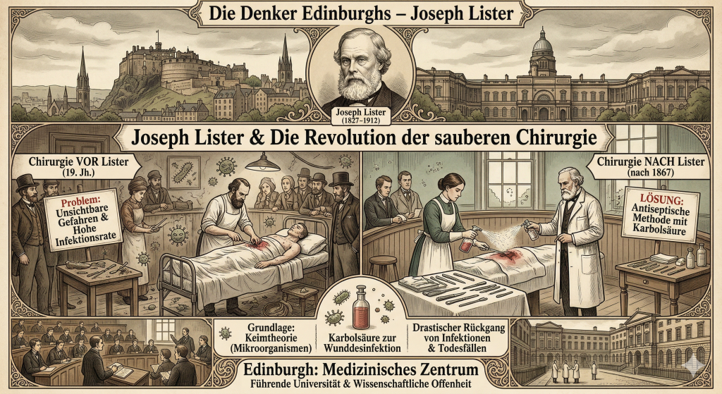 Die Universität und die medizinischen Einrichtungen Edinburghs gehörten zu den führenden Institutionen ihrer Zeit. Hier konnte Lister seine Ideen entwickeln, testen und verbreiten. Die Stadt bot eine Kombination aus wissenschaftlicher Offenheit und praktischer Anwendung, die für den Erfolg seiner Methoden entscheidend war.